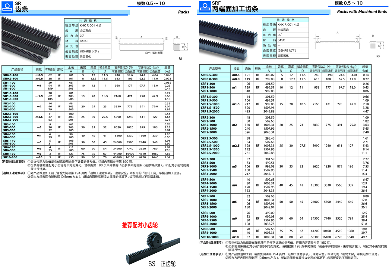 ② KRHG·KRHGF 齒磨齒斜齒齒條及 SRH 斜齒齒條的配對小齒輪有限制。另外 , 產(chǎn)品的輪齒旋向有右旋及左旋 ,請在選擇時注意旋向。