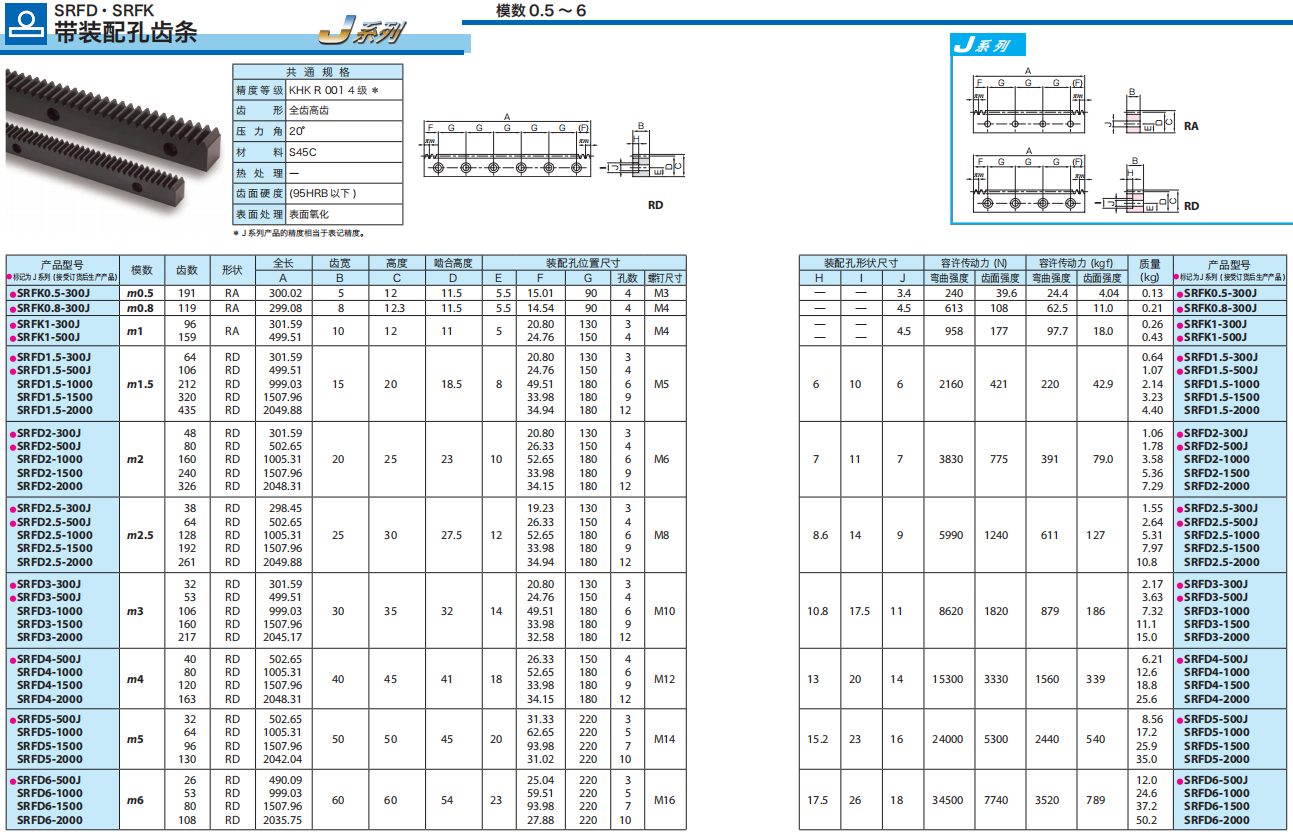高強度、壽命長??梢园残摹㈤L期使用的低價格硬化 齒條。還備有 J 系列成品。 |
