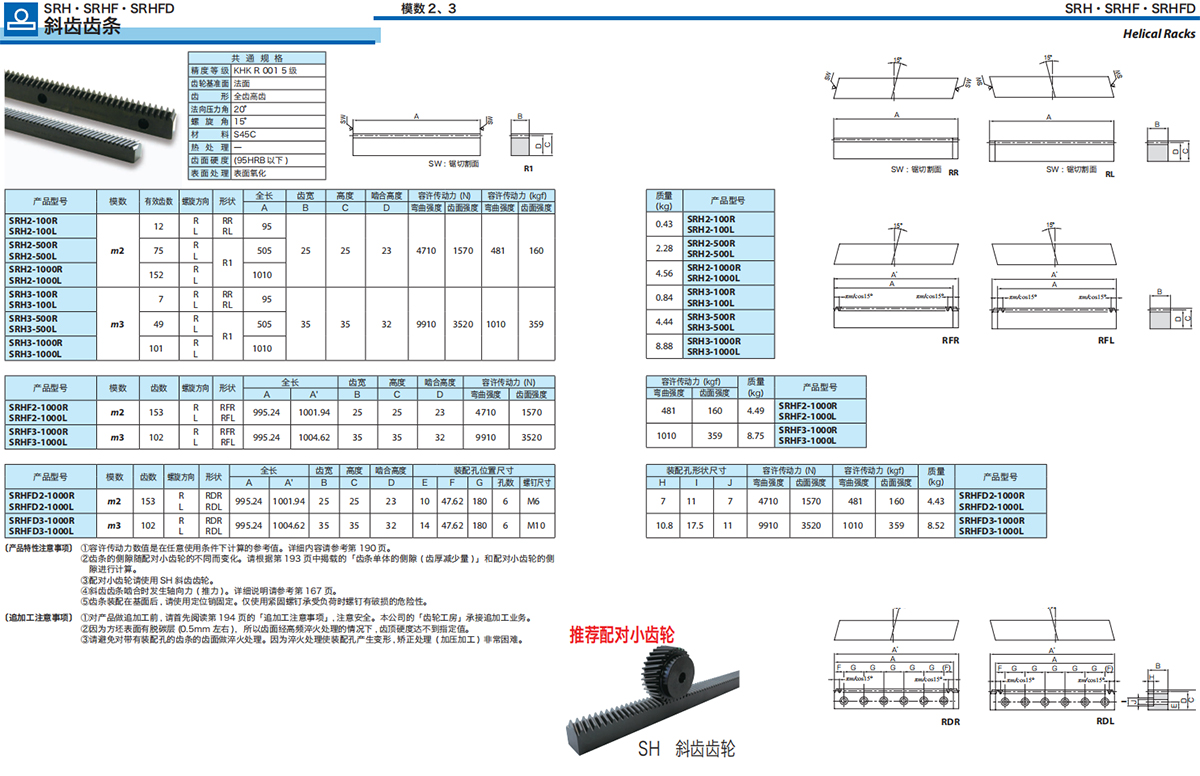 ② KRHG·KRHGF 齒磨齒斜齒齒條及 SRH 斜齒齒條的配對(duì)小齒輪有限制。另外 , 產(chǎn)品的輪齒旋向有右旋及左旋 ,請(qǐng)?jiān)谶x擇時(shí)注意旋向。