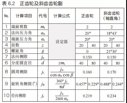 表6.2是正齒輪及斜齒輪齒輪副的側(cè)隙的計算例。增減中心距離(徑向齒隙),可以調(diào)節(jié)齒輪副的齒隙。